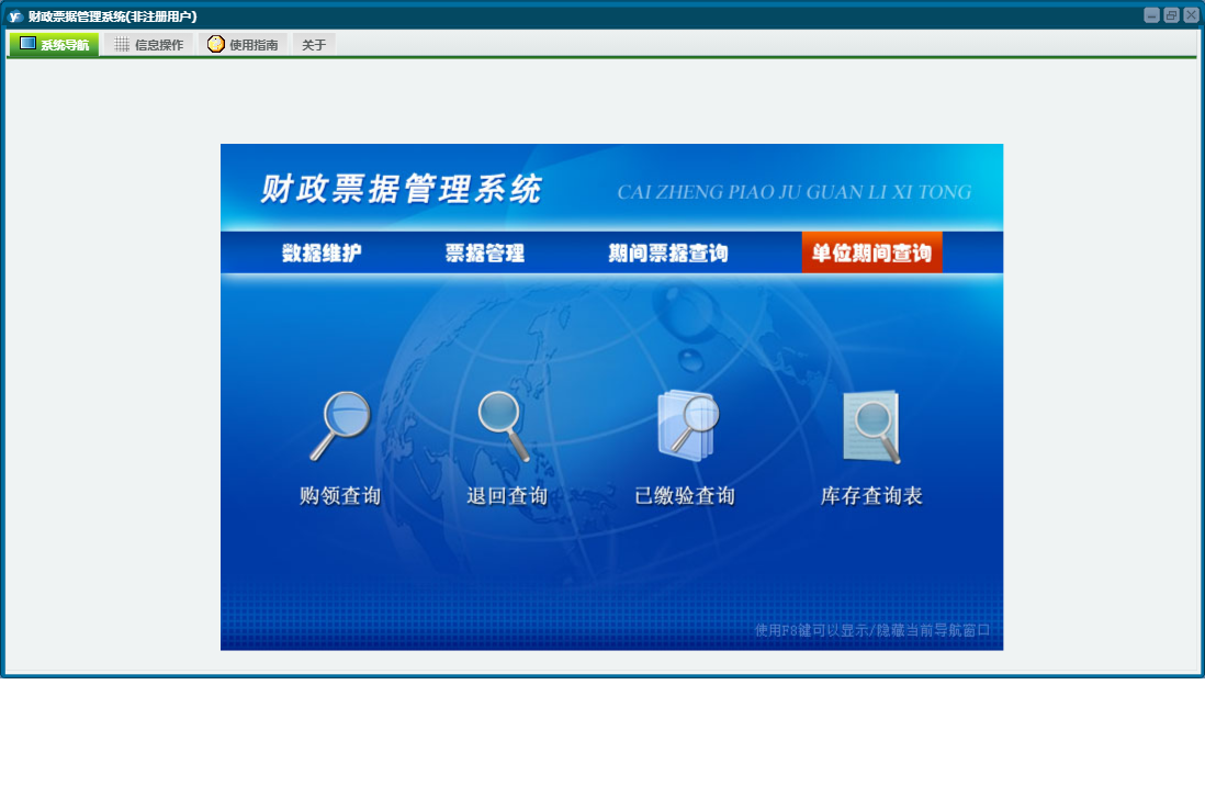财政票据管理系统包含以下功能:单位期间查询、票据维护、购领单位、票据发售、票据销毁、期间票据查询、票据入库、日志、票据缴验、关于、权限设置、票据管理、数据维护、票据作废、票据退回等