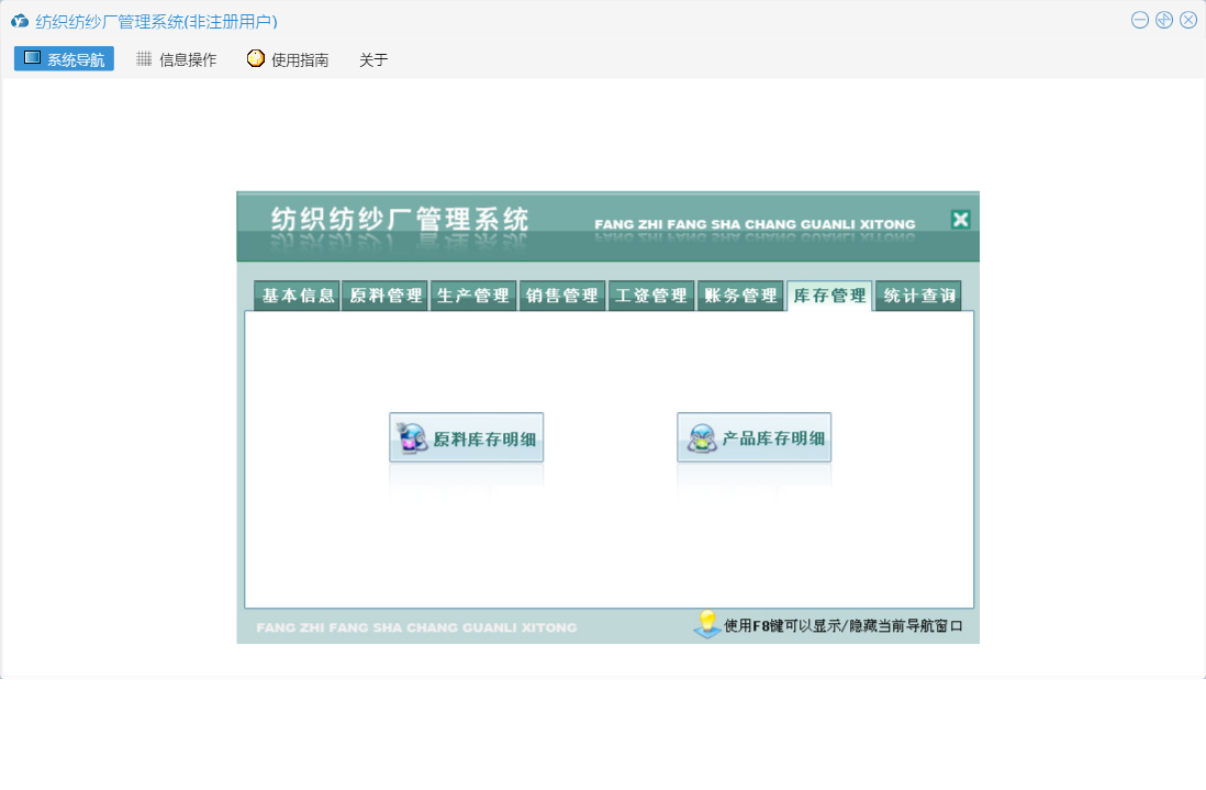 纺织纺纱厂管理系统包含以下功能:销售管理、产品信息、生产记录录入、发货登记、付原料供商欠款、财务管理、原料入库登记、设备档案、权限设置、统计查询、原料管理、工资管理、客户档案、原料信息、库存管理、关于、基本信息、订单录入、设备维修登记、员工档案、原料使用登记、产品入库、日志、经手人档案、生产管理、客户付欠款登记、供商信息等