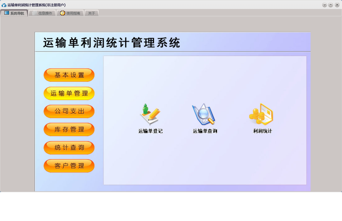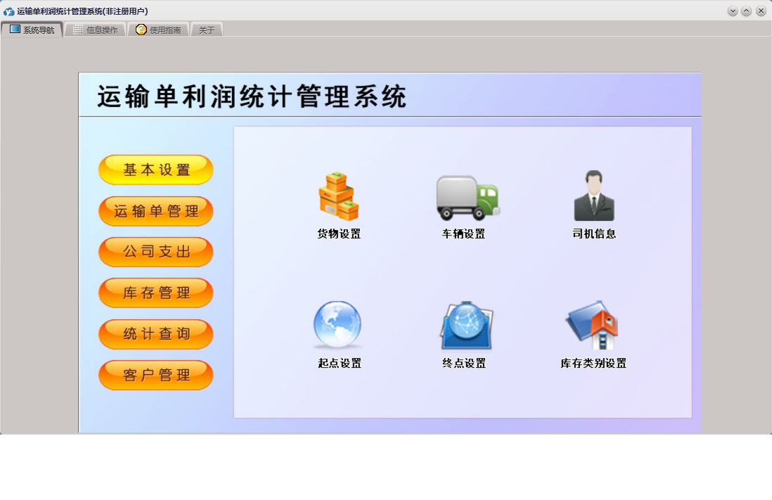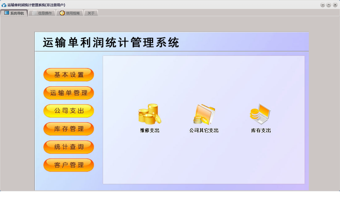 运输单利润统计管理系统包含以下功能:维修支出、基本设置、终点设置、起点设置、入库登记、库存基本设置、客户管理、权限设置、统计查询、客户付款登记、货物设置、车辆设置、库存管理、关于、运输单管理、客户信息、司机信息、运输单登记、日志、公司支出、公司其它支出、库存出库等