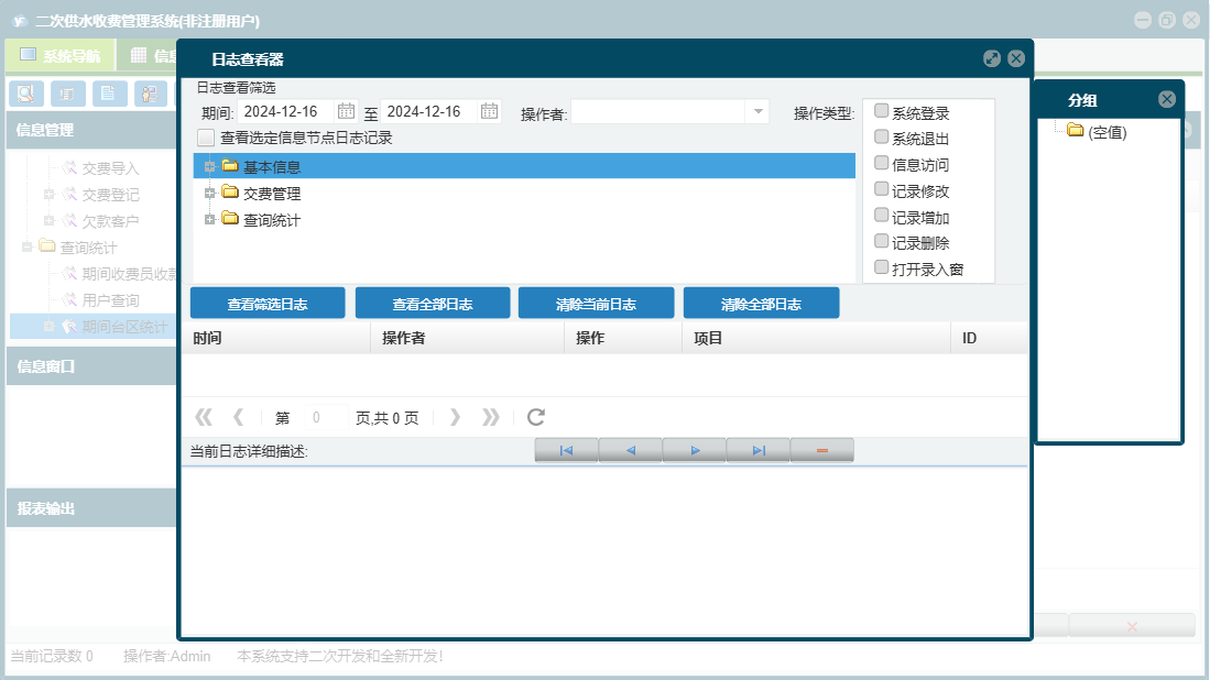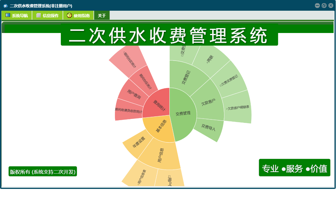 二次供水收费管理系统包含以下功能:用户信息、面板、日志、交费登记、关于、权限设置、欠款客户等