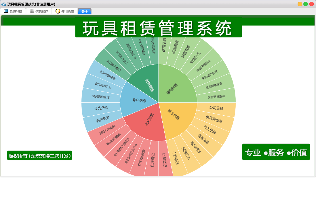 玩具租赁管理系统包含以下功能:采购销售、财务管理、归还登记、个性价签、商品信息、公司信息、销售退货、权限设置、会员充值、出租登记、其它收入登记、采购退货、其它支出登记、关于、基本信息、商品采购、客户信息、商品租赁、商品销售、员工信息、供货商信息、日志等