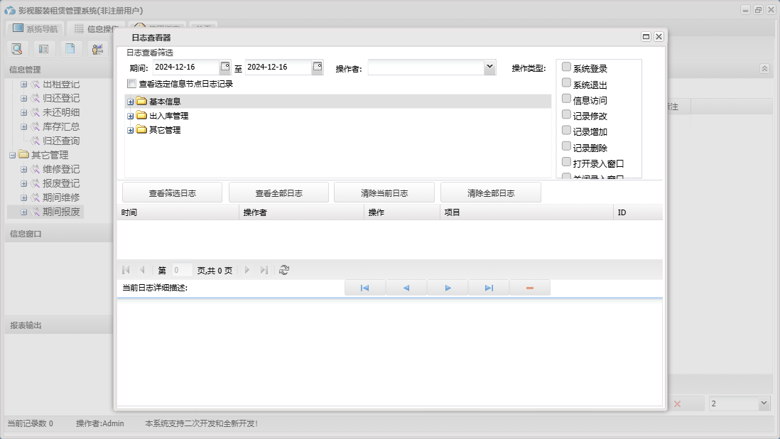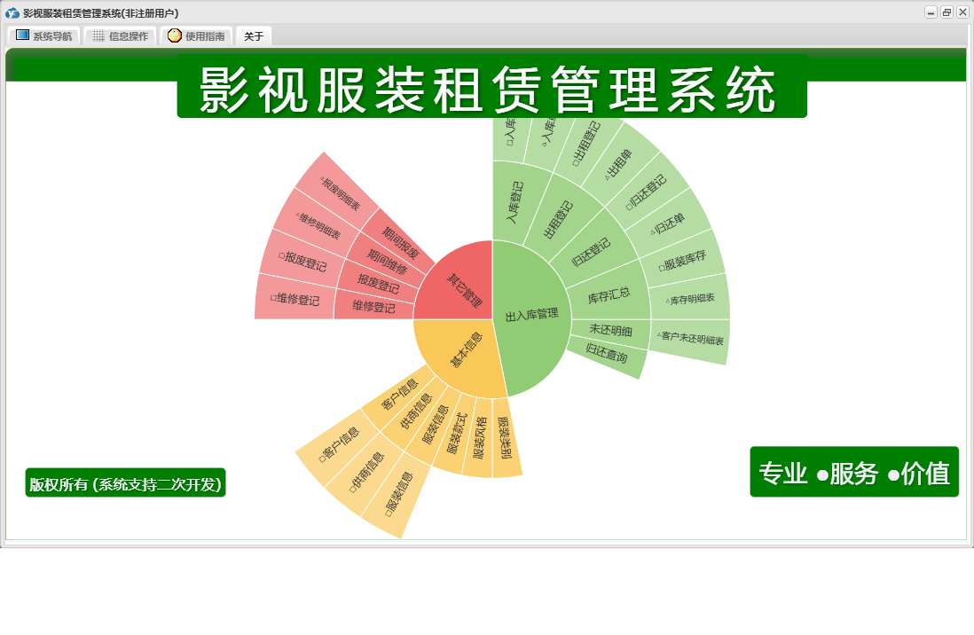 影视服装租赁管理系统包含以下功能:面板、日志、关于、权限设置、库存汇总等