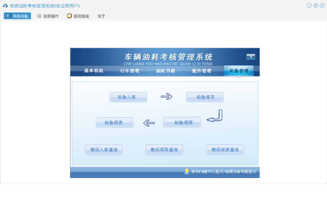 车辆油耗考核管理系统包含以下功能:行车记录、配件入库、轮胎入库、权限设置、运输起终点、轮胎管理、配件信息、轮胎报废、配件管理、配件领用、加油记录、关于、基本信息、轮胎领用、行车管理、行车记录查看、油耗考核对照表、日志、油耗节超、加油记录查看等