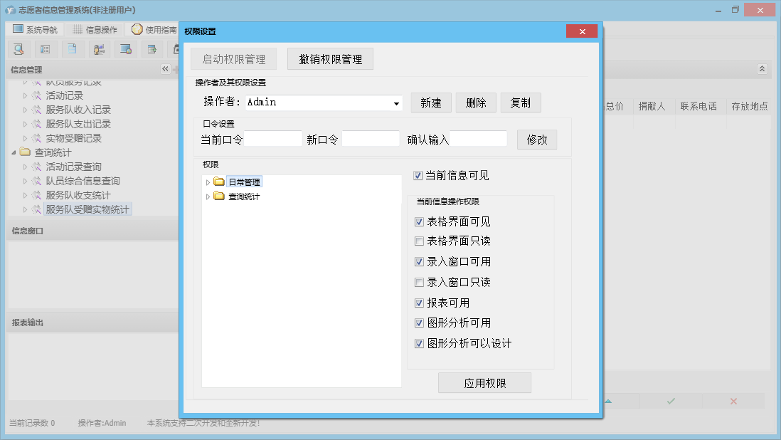 志愿者信息管理系统包含以下功能:队员服务记录、服务队收入记录、服务队支出记录、日志、关于、权限设置、统计查询、队员献血记录、队员资料、活动记录、主面板、实物受赠记录等