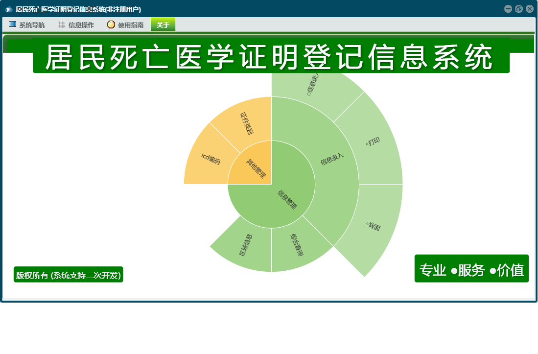居民死亡医学证明登记信息系统包含以下功能:关于、面板等