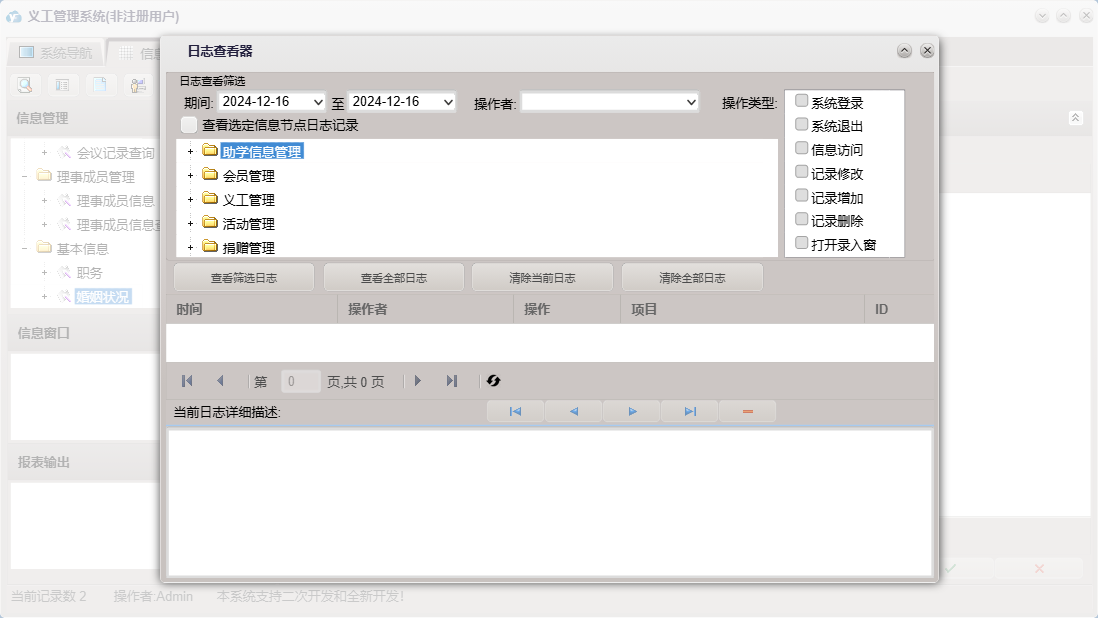 义工管理系统包含以下功能:捐赠信息、会员信息、面板、会议记录、学生信息、日志、职务、理事成员信息、结对信息、关于、活动信息、婚姻状况、义工信息、权限设置等