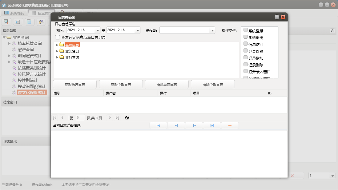 劳动事务代理收费管理系统包含以下功能:基础信息、收费项目设置、档案调转注销、业务登记、日志、档案托管登记、关于、权限设置、缴费登记、业务查询等