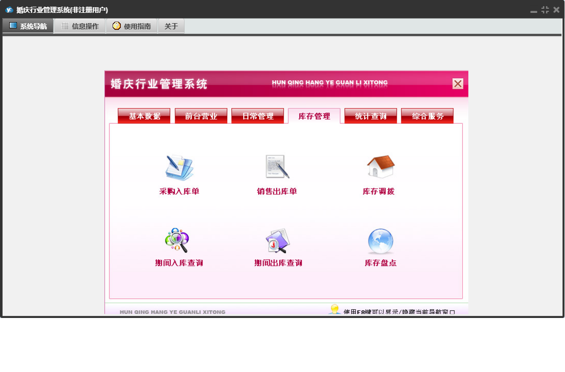 婚庆行业管理系统包含以下功能:收入登记、库存调拨、道具展示、销售出库单、采购入库单、基础数据、单位设置、商品信息、统计查询、权限设置、项目设置、仓库信息、综合服务、项目展示、支出登记、库存管理、关于、前台营业、填写订单、日常管理、供货单位、道具设置、库存盘点、员工信息、收支类别、日志、套系设置、客户回访等