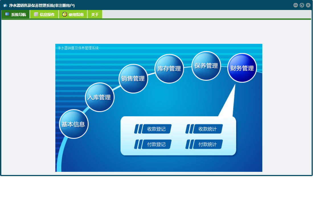净水器销售及保养管理系统包含以下功能:入库管理、销售管理、保养登记、日志、库存管理、关于、权限设置、基本信息、保养管理、财务管理等