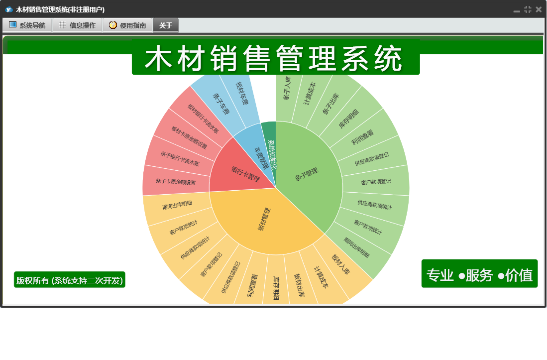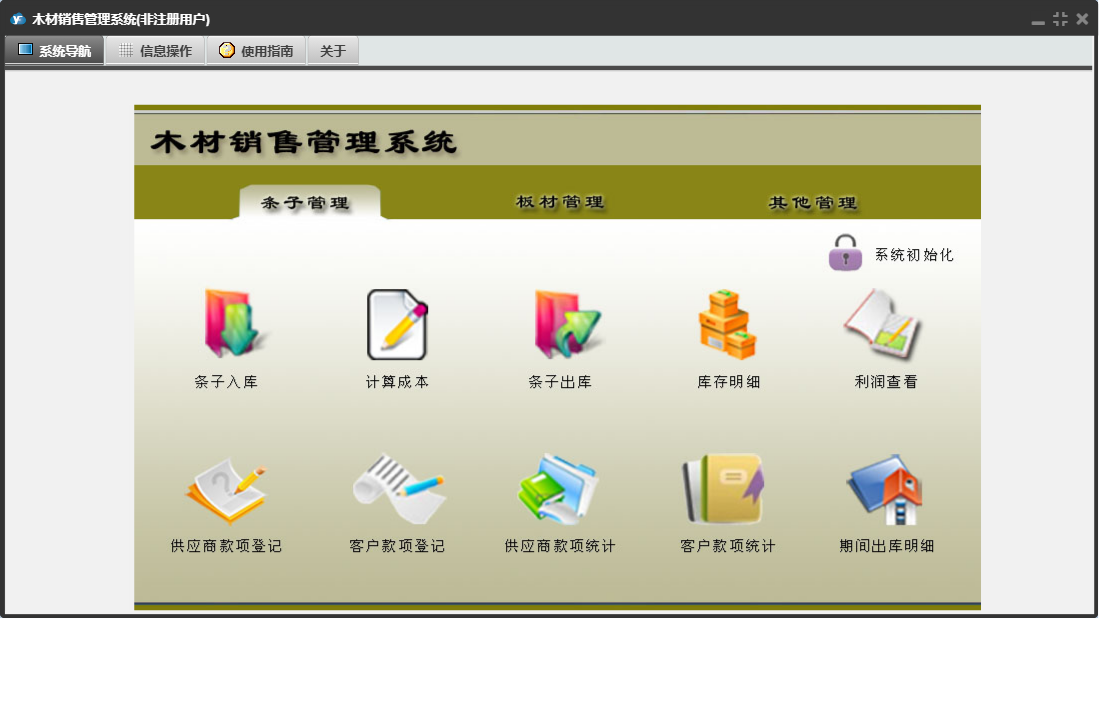 木材销售管理系统包含以下功能:条子出库、条子入库、板材入库、板材管理、条子管理、板材银行卡流水账、条子银行卡流水账、日志、供应商款项登记、关于、权限设置、条子车费、板材车费、其它管理、板材出库、客户款项登记等