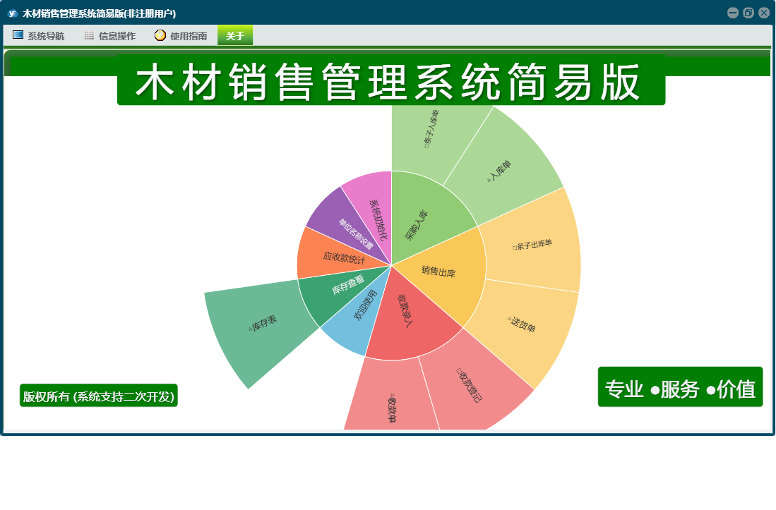 木材销售管理系统简易版包含以下功能:关于、主面板等