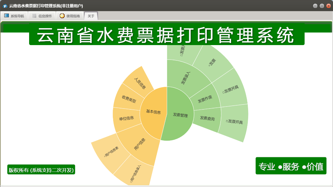 云南省水费票据打印管理系统包含以下功能:发票作废、用户信息、日志、发票查询、关于、权限设置、发票录入、主等
